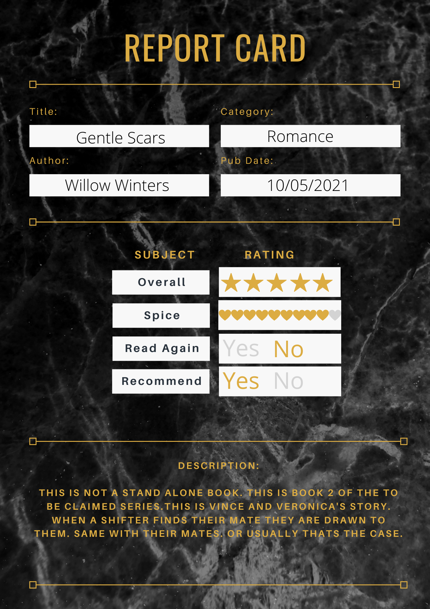 Gentle Scars, as mentioned, is the second book in the To Be Claimed series. In the first book, Wounded Kiss, we were introduced to Lizzie, Caleb and Dom and Grace and Devin. In this book we get to hear Veronica and Vince’s story as well. When we last saw, well heard about, Vince in the first book he was MIA after looking for his mate. In Gentle Scars we find out what happened to Vince and his mate. It turns out she is a vampire who was there to reach out to his wolf pack to ask for assistance. Obviously nothing ever happens that easily and complications arise. We get to follow all three of the very spicy relationships that each group has while we learn how they deal with the changes in their lives and conflicts that are coming to the surface.